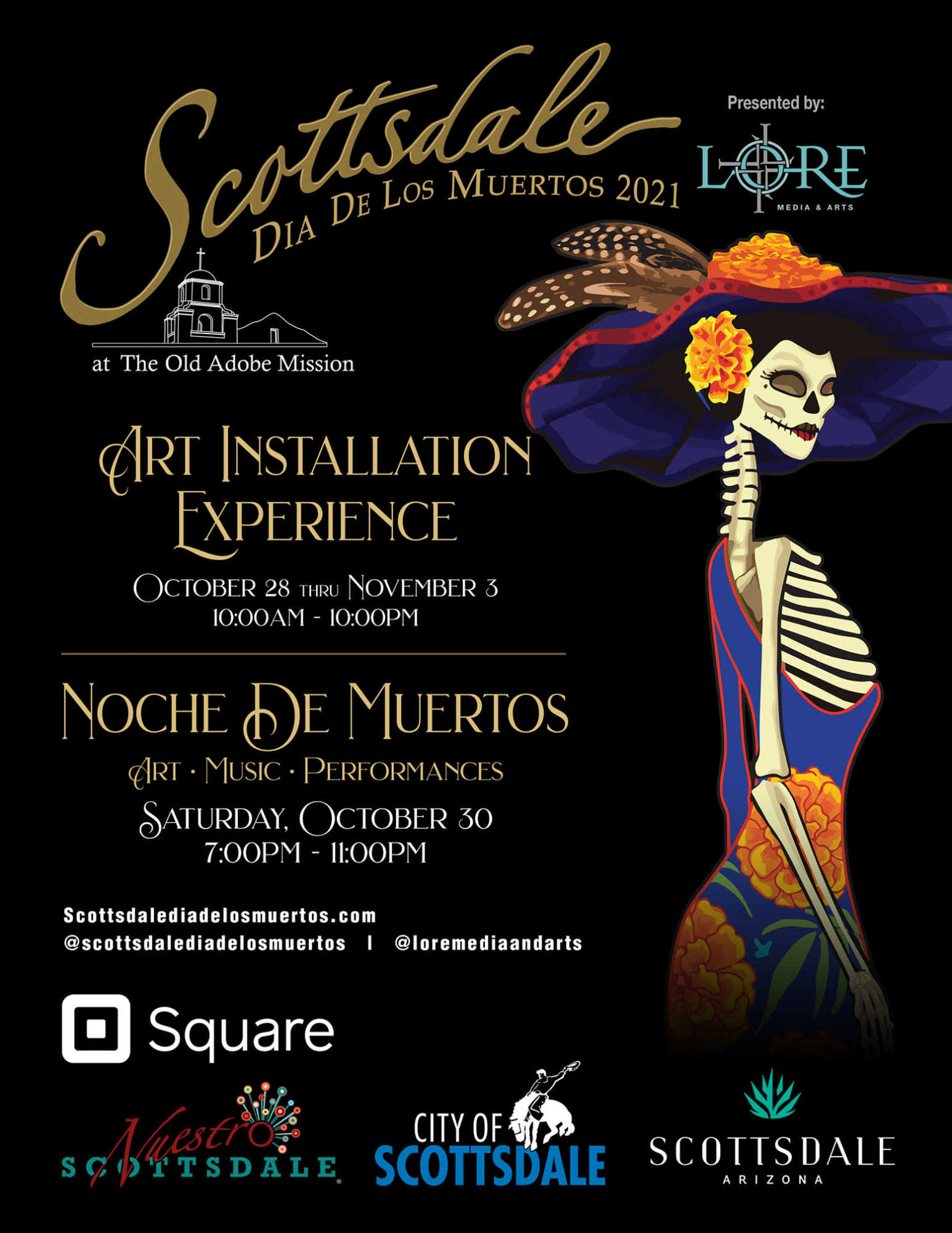 LORE Media and Arts presents the 5th annual Scottsdale Dia de los Muertos! We will return to Scottsdale for an intimate Art Installation Experience from October 28 thru November 3 and host an evening of special programming for Noche de Muertos on Saturday, October 30.