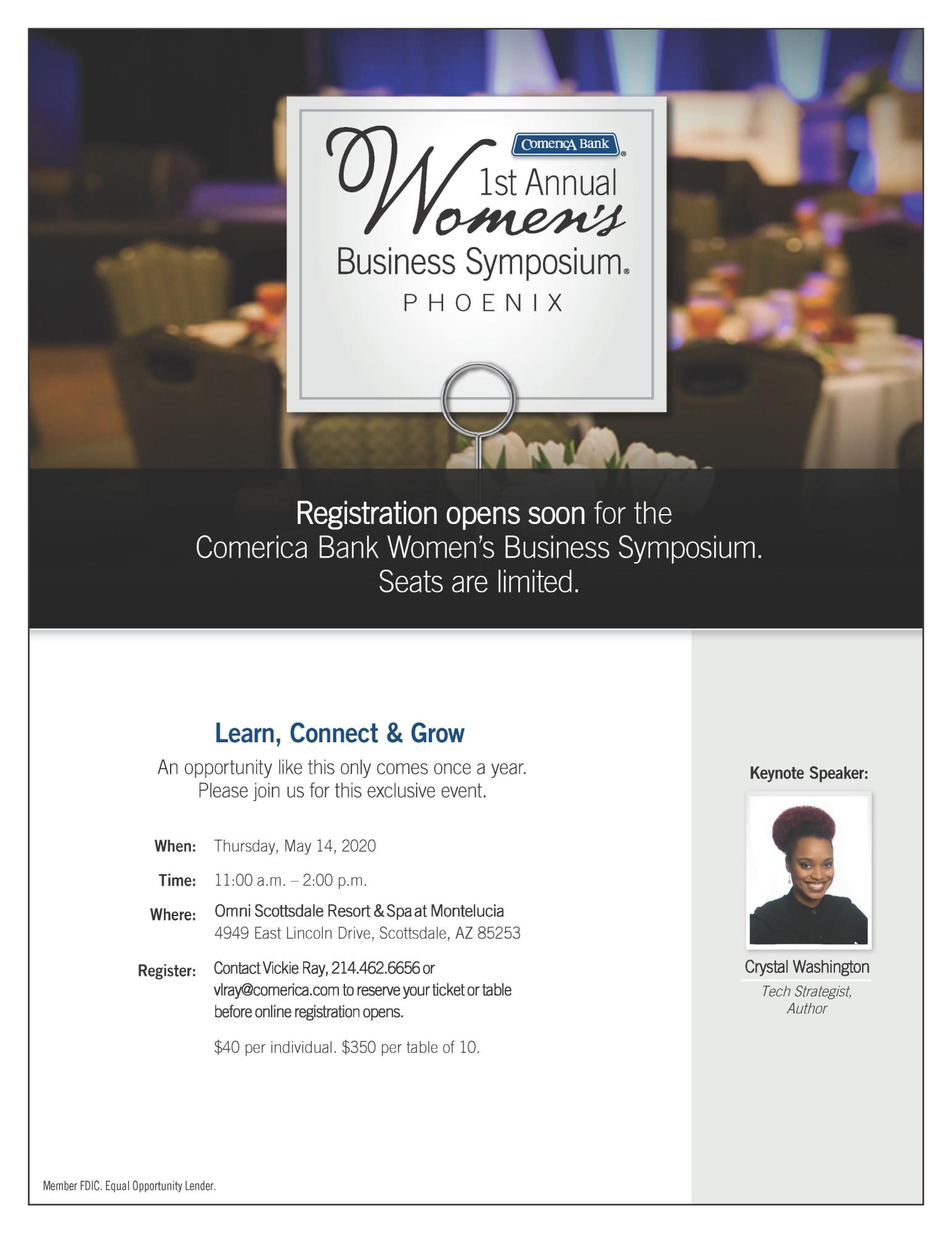 Comerica Women's Business Symposium has been canceled. The decision was made due to the growing health concerns of the Corona virus for event attendees. Please visit our website for updates on the rescheduled event date later this year.