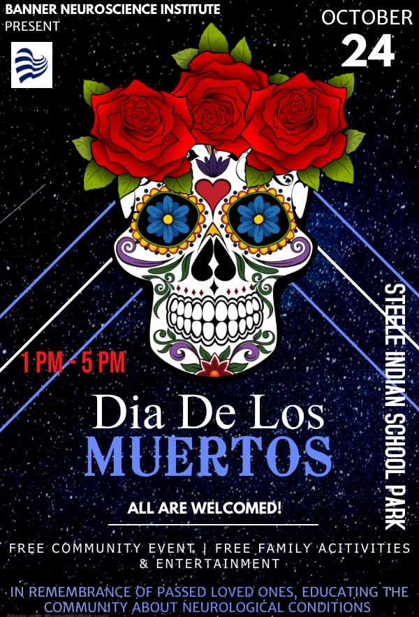 Come and join us in celebration of Dia De Los Muertos (Day of the Dead) Sunday, October 24th from 1-5 pm. We will have a booth to educate and bring awareness of our neurosciences program. Most importantly, we will also have an altar dedicated to the remembrance of our patients, family members, and loved ones who have passed on due to neurological conditions.