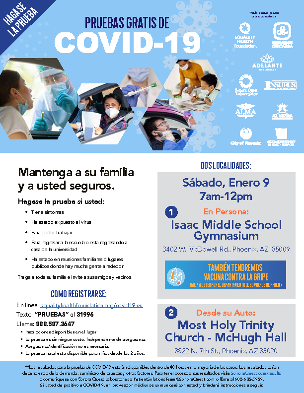 FREE COVID-19 Testing & FLU Shot Events Back to Search FREE COVID-19 Testing & FLU Shot Events Saturday, January 9, 2021 (7:00 AM - 12:00 PM) (MST) Description Additional Info × Address Phoenix, AZ United States Saturday, January 9, 2021 (7:00 AM - 12:00 PM) (MST) Categories Community Event Registered Guests × Share × Print Email Add to Calendar Facebook LinkedIn X Pinterest Powered By GrowthZone