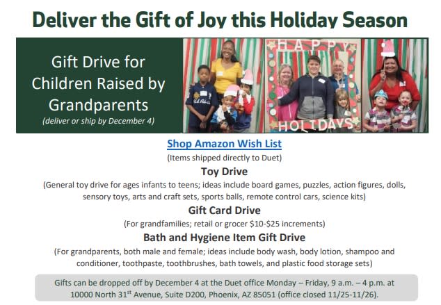 Gifts can be dropped off by December 4 at the Duet office Monday – Friday, 9 a.m. – 4 p.m. at 10000 North 31st Avenue, Suite D200, Phoenix, AZ 85051 (office closed 11/25-11/26).