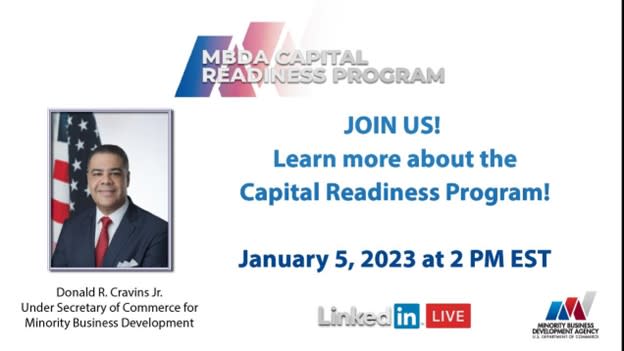 MBDA Capital Readiness Program Back to Search MBDA Capital Readiness Program Thursday, January 5, 2023 (12:00 PM - 1:00 PM) (MST) Description Join the Minority Business Development Agency as we hosts an information session for the MBDA Capital Readiness Program on LinkedIn Live! Additional Info × Webinar Thursday, January 5, 2023 (12:00 PM - 1:00 PM) (MST) Categories Community Event Registered Guests × Share × Print Email Add to Calendar Facebook LinkedIn X Pinterest Powered By GrowthZone