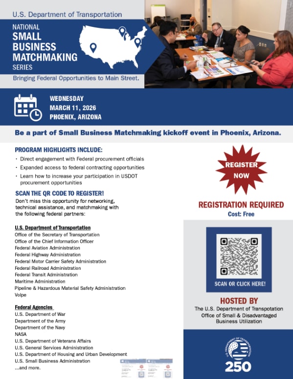Series Kickoff: Phoenix, Arizona Date: March 11 Location: Phoenix, AZ 🚀 Program Highlights Direct Access: Engage one-on-one with the U.S. Department of Transportation (USDOT) and other federal procurement officials.