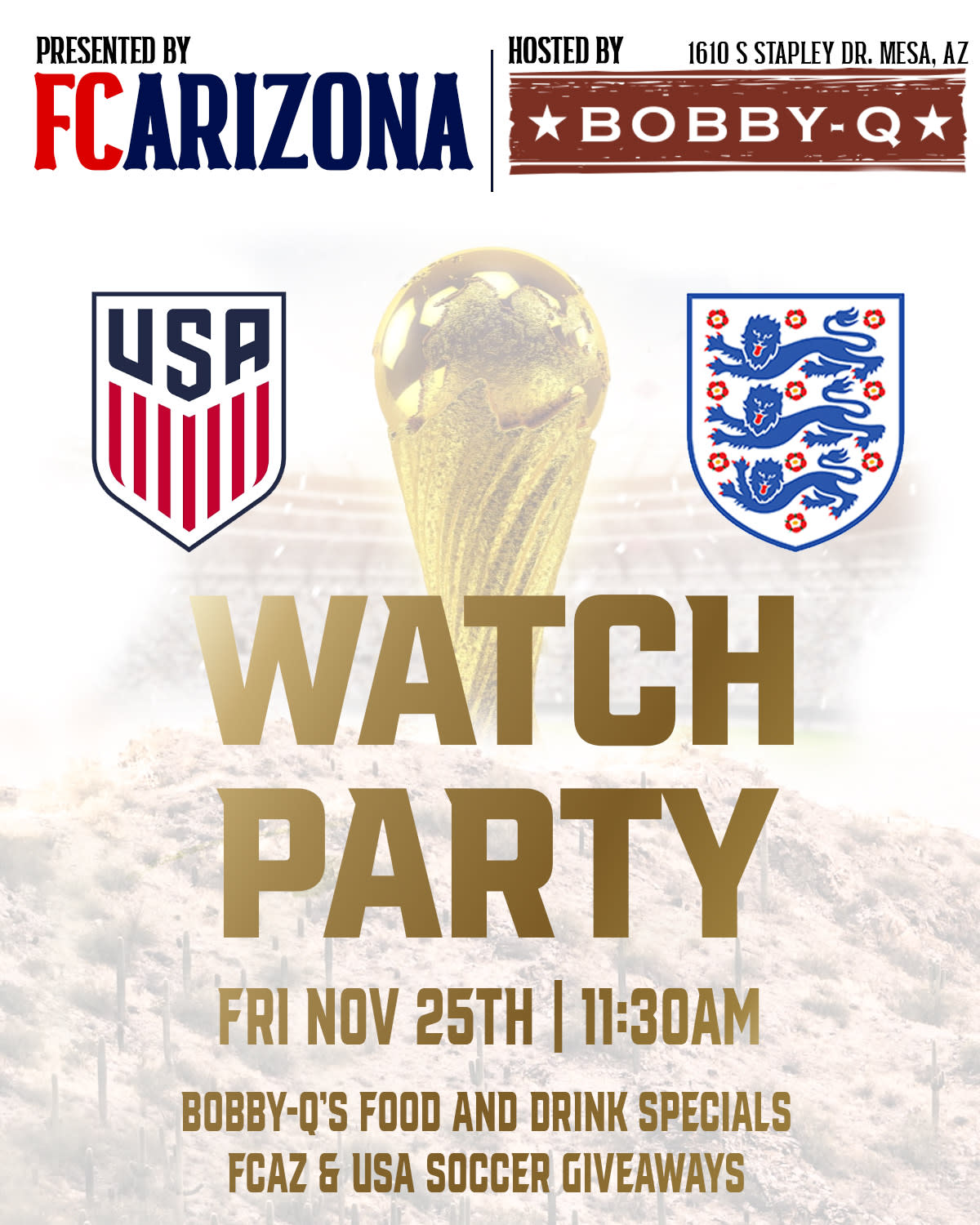 Join FC Arizona at Bobby-Q's as we watch the US Men's National Team take on England's National Team in this historic classic of the 2022 World Cup! USMNT & FC Arizona Giveaways & Lunch Specials!