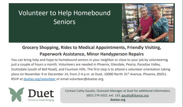The first step is to attend a volunteer orientation taking place on November 9 or December 14, from 2-4 p.m. at Duet, 10000 North 31st Avenue, Phoenix, 85051. RSVP at duetaz.org/volunteer or email volunteer@duetaz.org.