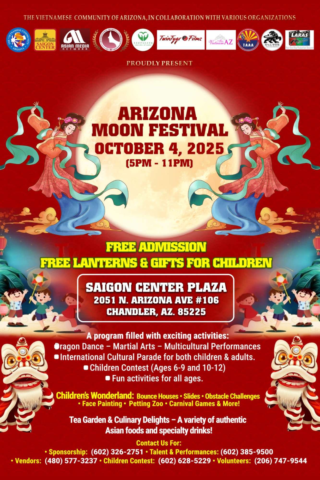DESCRIPTION:AZ MOON FESTIVAL 2025 at Saigon Center Plaza!!!  October 4\, 2025 | 5:00 PM   11:00 PM 🗓 October 5\, 2025 | 5:00 PM   8:30 PM 📍 Saigon Center Plaza   2051 N. Arizona Ave #106\, Chandler\, AZ 85225 🎟️ FREE Admission | Open to All Ages ✨🌕 Celebrate Mid-Autumn Magic with Us! 🌕✨ The Vietnamese Community of Arizona\, in collaboration with GL\, Twintygr @Films\, NTH\, and ARIZONA\, proudly presents one of the largest Vietnamese cultural celebrations in Arizona!FREE Admission | Open to All Ages Celebrate Mid-Autumn Magic with Us! \nThe Vietnamese Community of Arizona\, in collaboration with GL\, Twintygr @Films\, NTH\, and ARIZONA\, proudly presents one of the largest Vietnamese cultural celebrations in Arizona! HEADLINERS & LIVE PERFORMANCES Special Guest Artists   To Be Announced!\n Dynamic Live Music & Singing\n Cultural & Traditional Dances\n Martial Arts Showcases\n International Parade with Community Groups CHILDREN'S CONTEST Age Groups: 6 9 & 10 12\n Show off your talent in front of a live audience!\n Fun prizes\, spotlight moments & community recognition Children's Wonderland Zone:\n  Bounce Houses\n  Obstacle Courses\n  Face Painting\n  Carnival Games\n  Petting Zoo\n  Slides & More! FOOD & CULTURE EXPERIENCETea Garden\n Culinary Delights   Authentic Asian street food & specialty drinks\n Free Lanterns & Gifts for Children (while supplies last) FOR MORE INFORMATION\n  Sponsorship: (602) 326-2751\n  Talent & Performances: (602) 385-9500\n  Children Contest: (602) 628-5229\n  Vendors: (623) 707-9997\n  Volunteers: (619) 366-8886 Bring your friends and family for two nights of vibrant culture\, live entertainment\, community fun\, and memories that last a lifetime. Dress in your traditional attire and be part of this beautiful celebration under the moonlight! Follow us on Facebook & Instagram for updates and artist announcements!