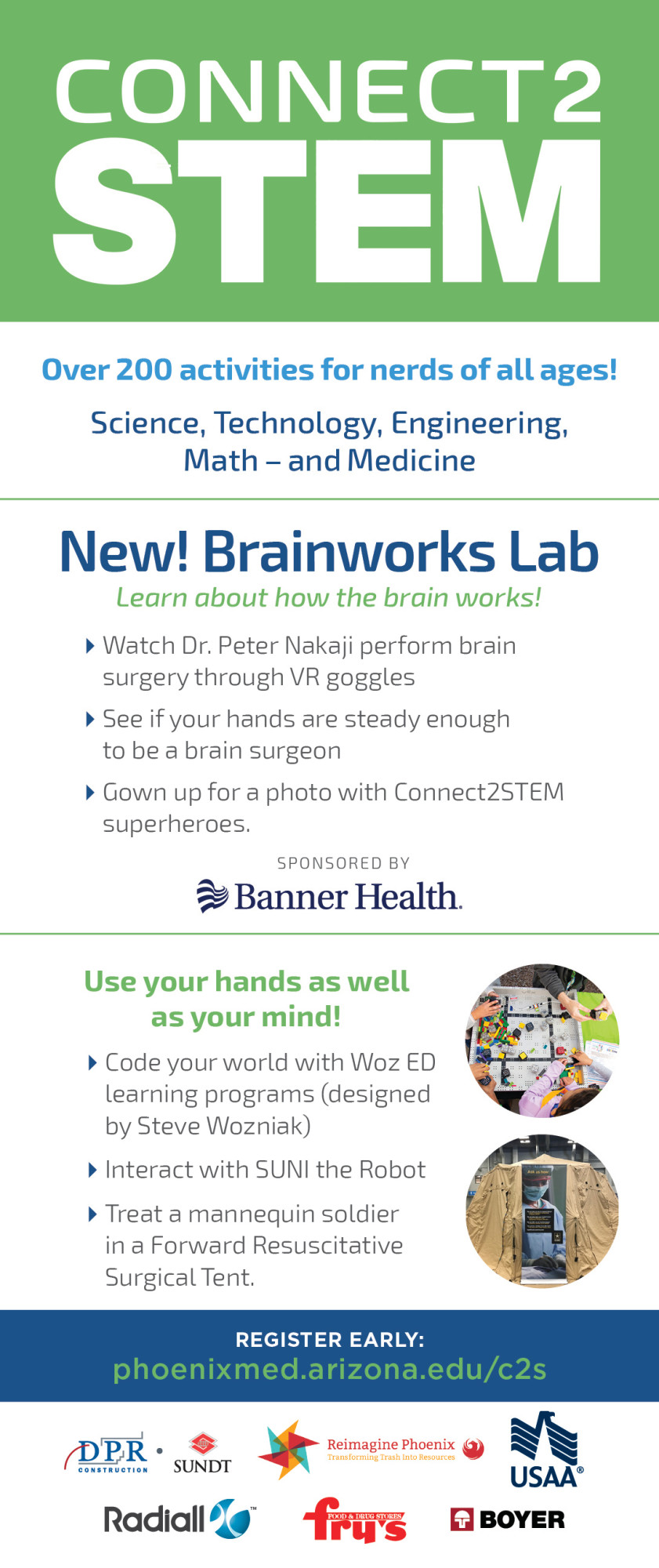 The University of Arizona (UA), in partnership with Cox Communications, presents Connect2STEM — a family friendly event, which celebrates Science, Technology, Engineering, Math and Medicine. The event is officially the largest STEM-related event held in Phoenix on the Phoenix Biomedical Campus.